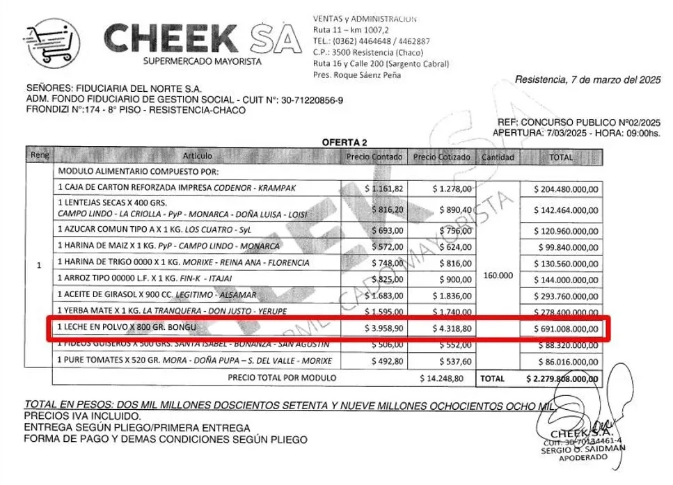 La operación se realizó a través de Fiduciaria del Norte S.A., el organismo estatal que gestiona los fondos, el cual licitó 480.000 módulos a principios de marzo de 2025 y adjudicó los tres tramos del concurso a Cheek S.A.. La compra incluyó 128 toneladas de leche en polvo de las marcas “Bongú” y “Purilac”. Estos productos fueron cuestionados ya que, al parecer, no cumplen con los estándares nutricionales y organolépticos exigidos por el Código Alimentario Argentino.