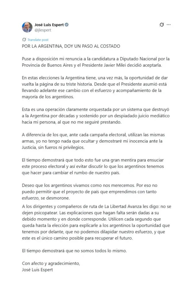 Finalmente, pese a que en los últimos dos días había ratificado su postulación, y luego de dos semanas que tuvieron en vilo al Gobierno, José Luis Espert renunció a su candidatura a diputado nacional por la provincia de Buenos Aires, acorralado por las acusaciones de haber recibido un pago de USD 200 mil del empresario Fred Machado, investigado por narcotráfico.Lo hizo a través de un posteo en su cuenta de la red social X, en donde contó que le presentó la dimisión al presidente Javier Milei, y este decidió aceptarla. “Demostraré mi inocencia en la Justicia, sin fueros ni privilegios”, escribió en un largo texto en la plataforma virtual.