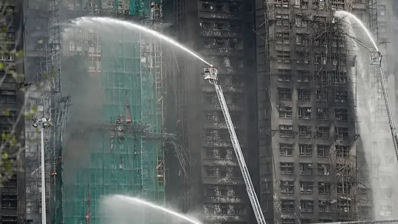 Los servicios de emergencia continúan combatiendo las llamas en el complejo residencial Wang Fuk Court (Hong Kong, China) este jueves, un día después del inicio del voraz incendio que ha dejado al menos 55 personas fallecidas y cerca de 300 desaparecidas.
